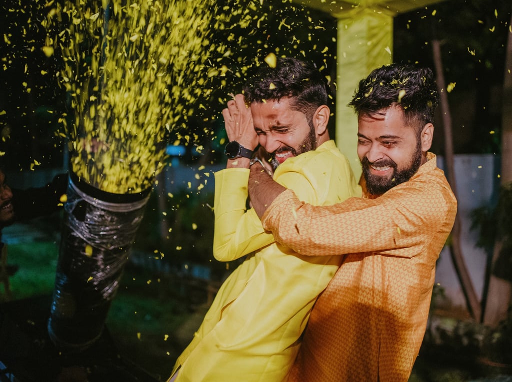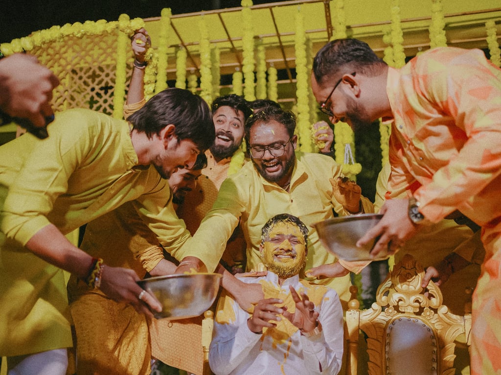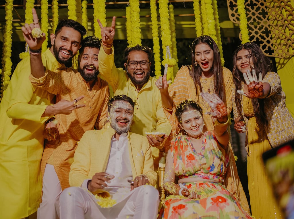 The festivities began with a high-spirited haldi ceremony. Set outdoors under warm Ahmedabad skies, the event was filled with vibrant colors, floral decor, and candid moments. Jatin, known by many as “Amdavadi Man” brought his trademark energy, while Sakshi glowed with excitement. Family and friends joined in with playful smears of turmeric, infectious laughter, and joyful dancing — making the haldi ceremony especially rich with emotion and spontaneity.