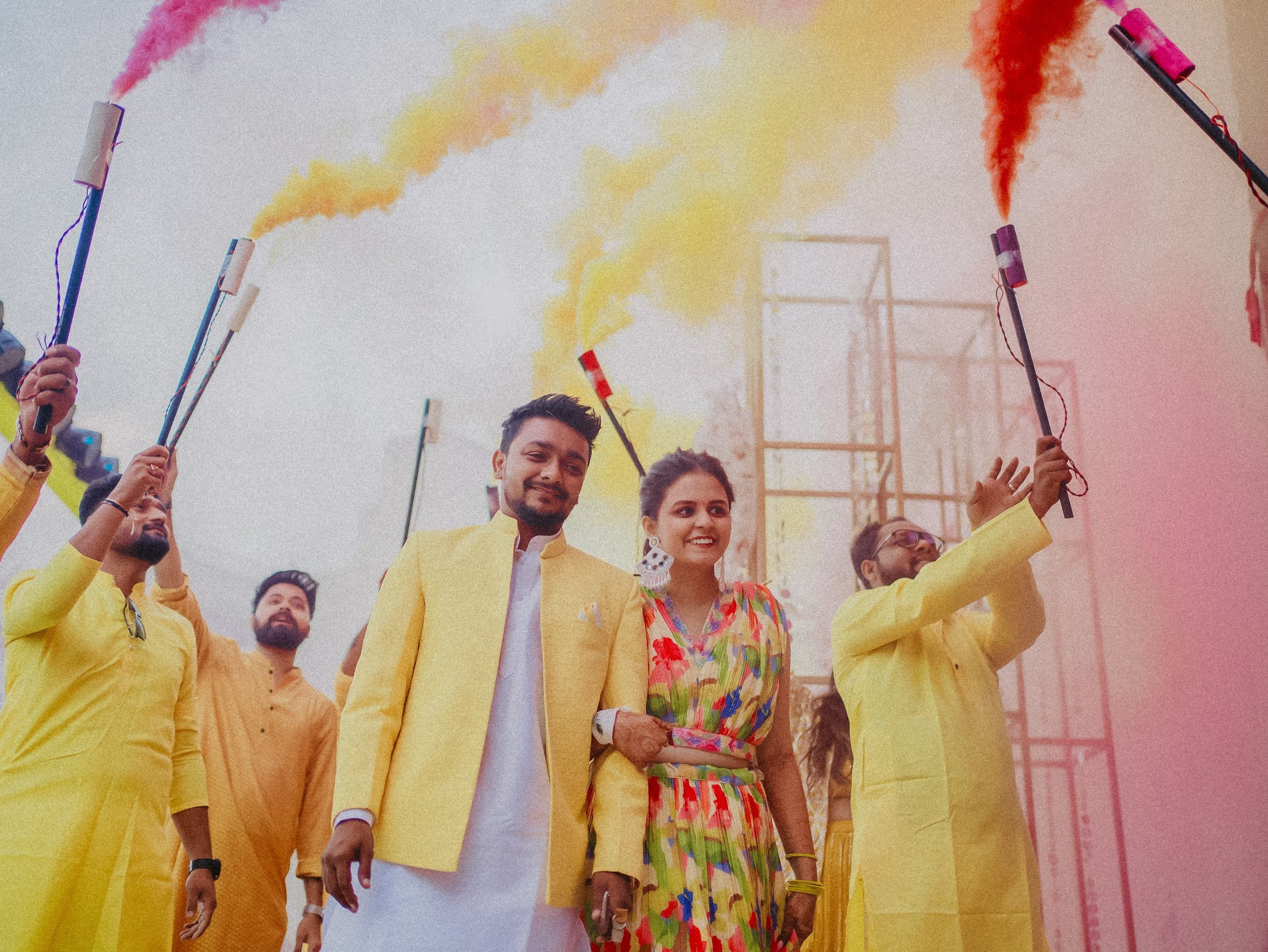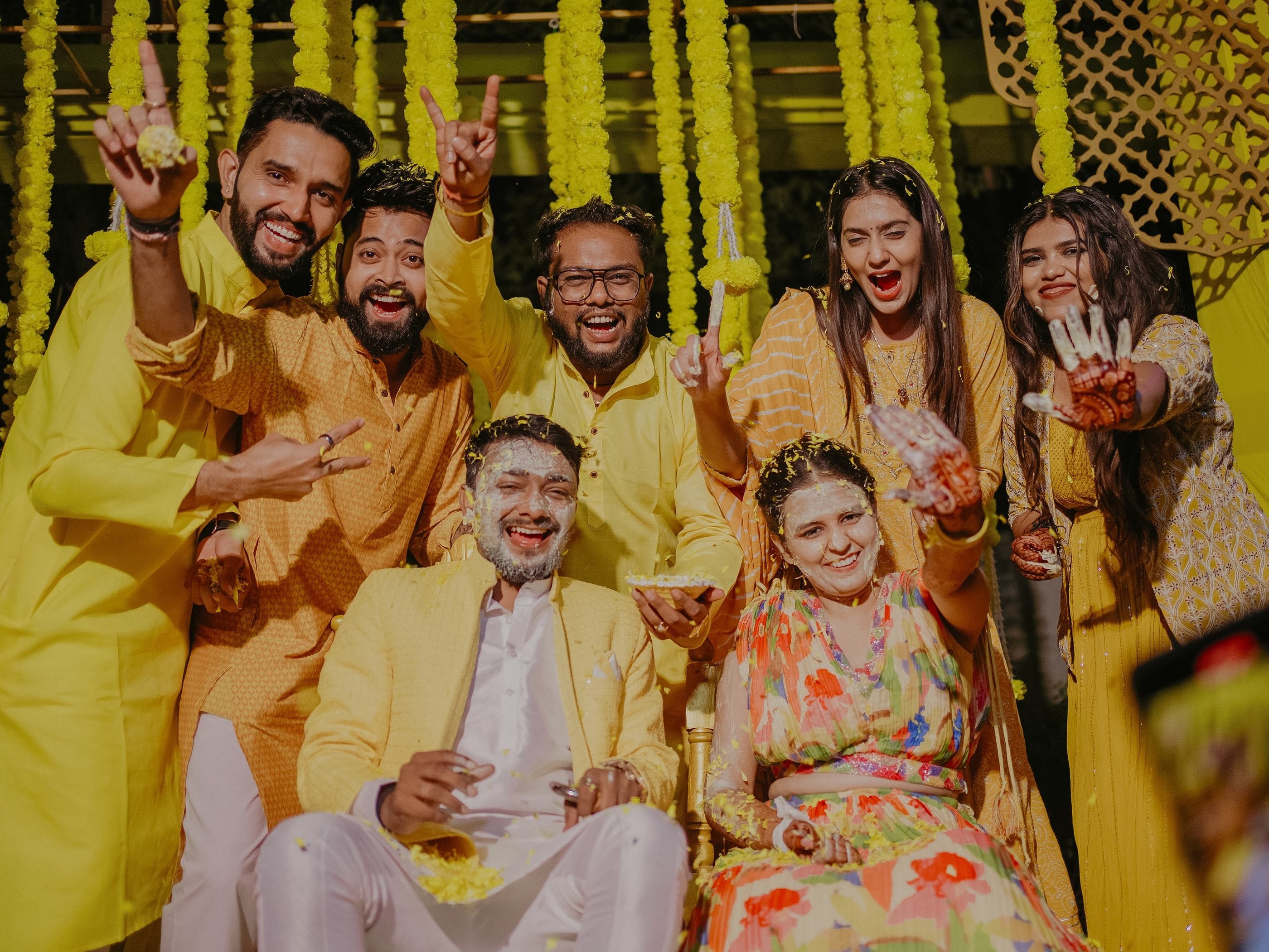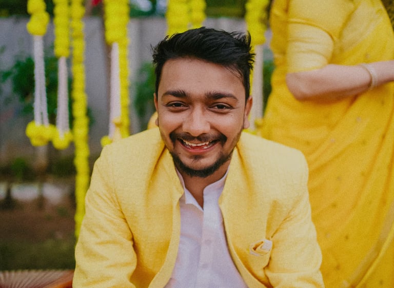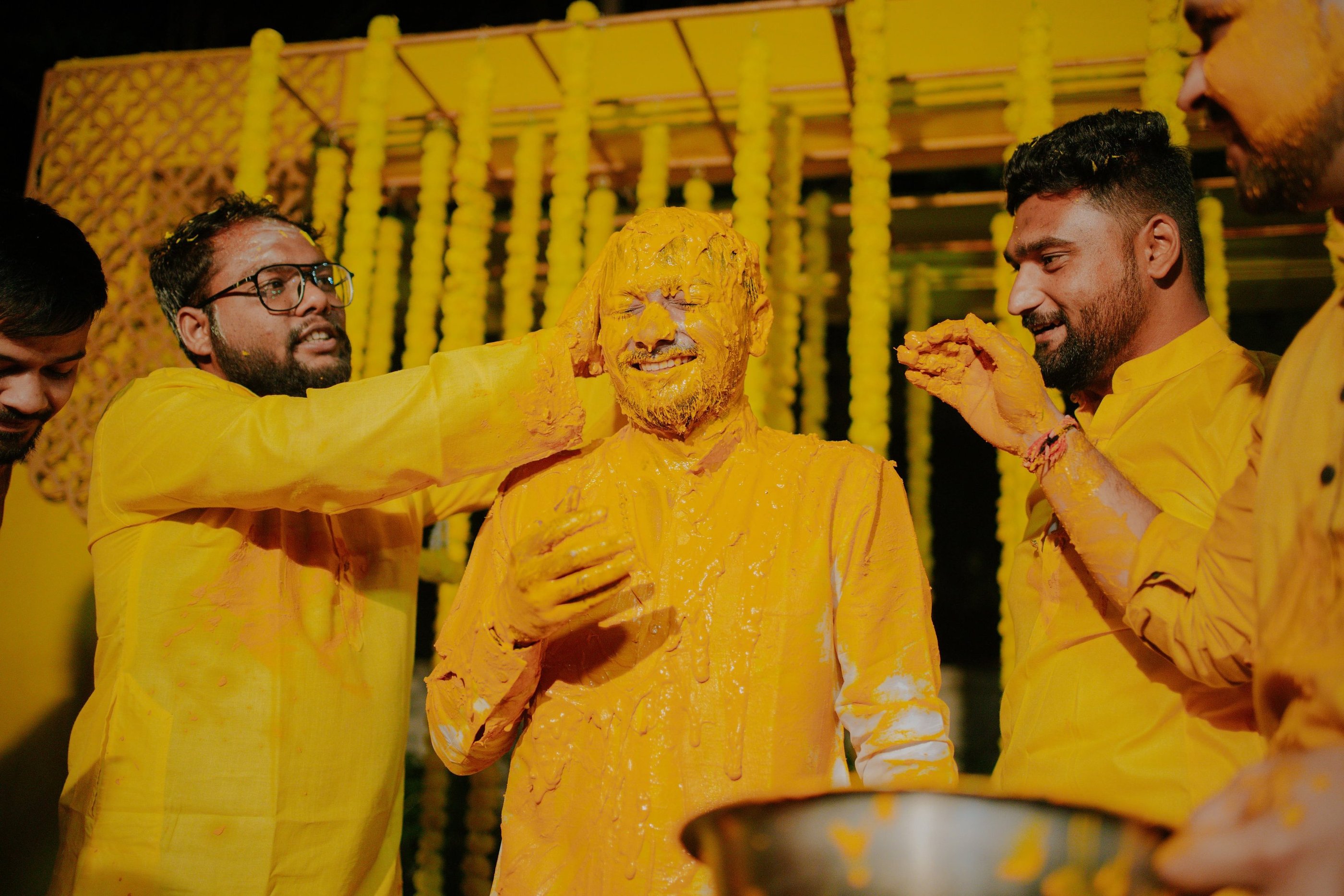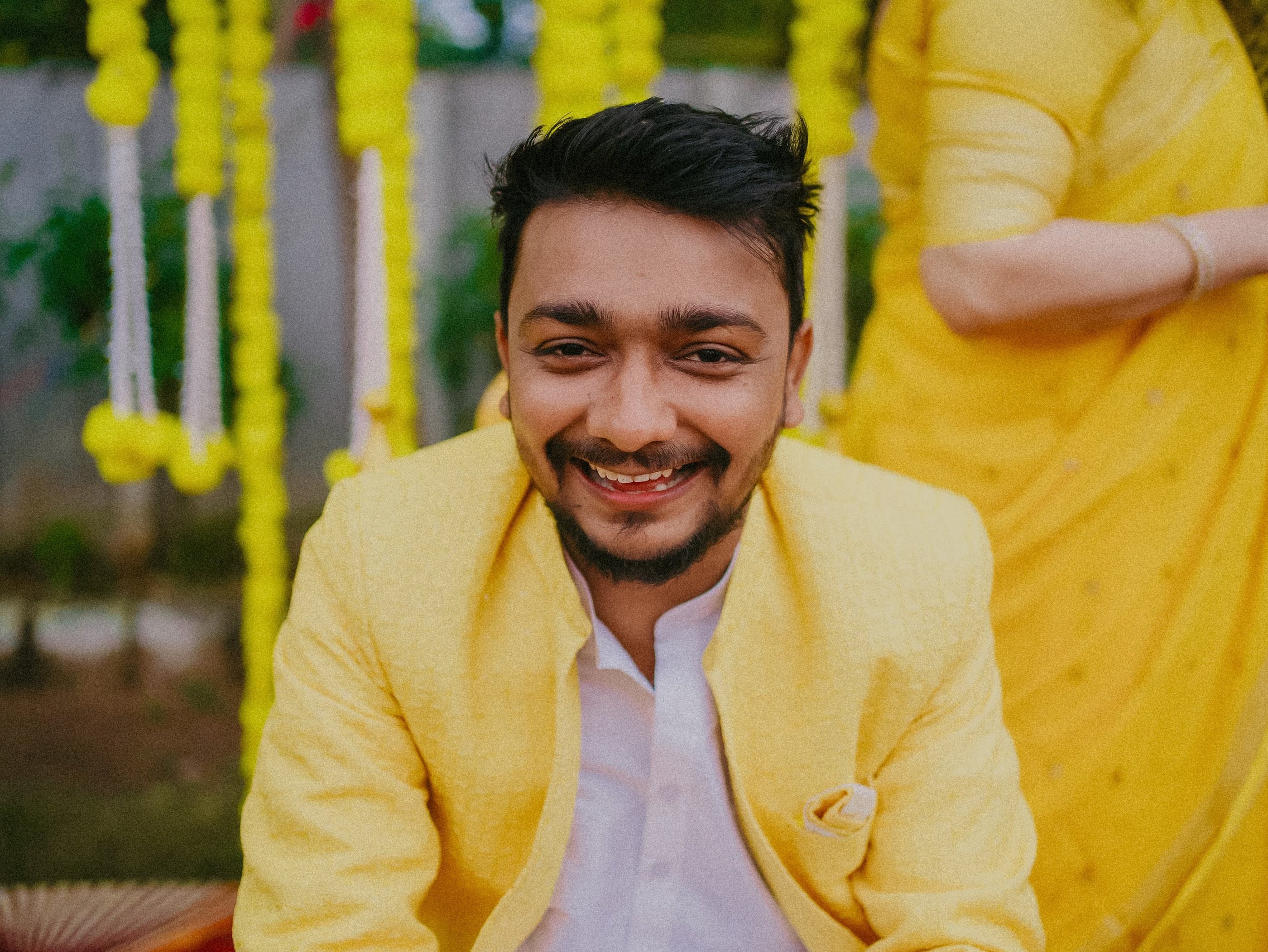 The festivities began with a high-spirited haldi ceremony. Set outdoors under warm Ahmedabad skies, the event was filled with vibrant colors, floral decor, and candid moments. Jatin, known by many as “Amdavadi Man” brought his trademark energy, while Sakshi glowed with excitement. Family and friends joined in with playful smears of turmeric, infectious laughter, and joyful dancing making the haldi ceremony especially rich with emotion and spontaneity.