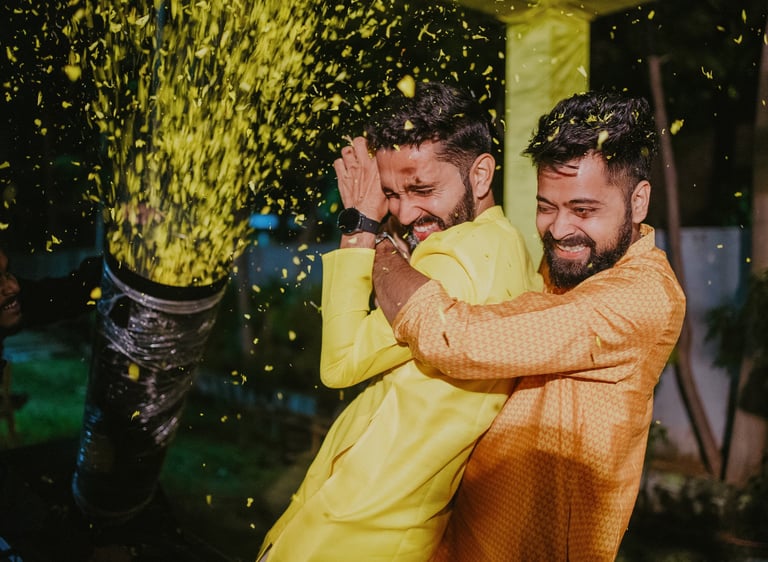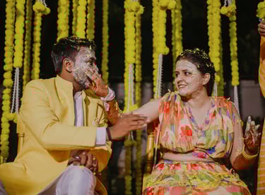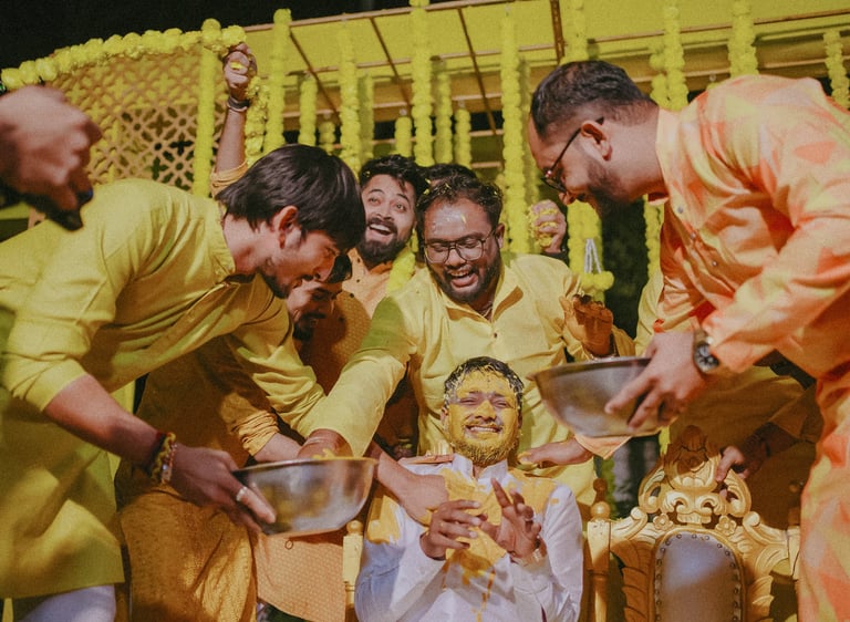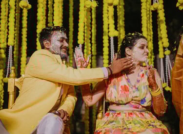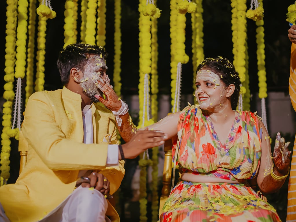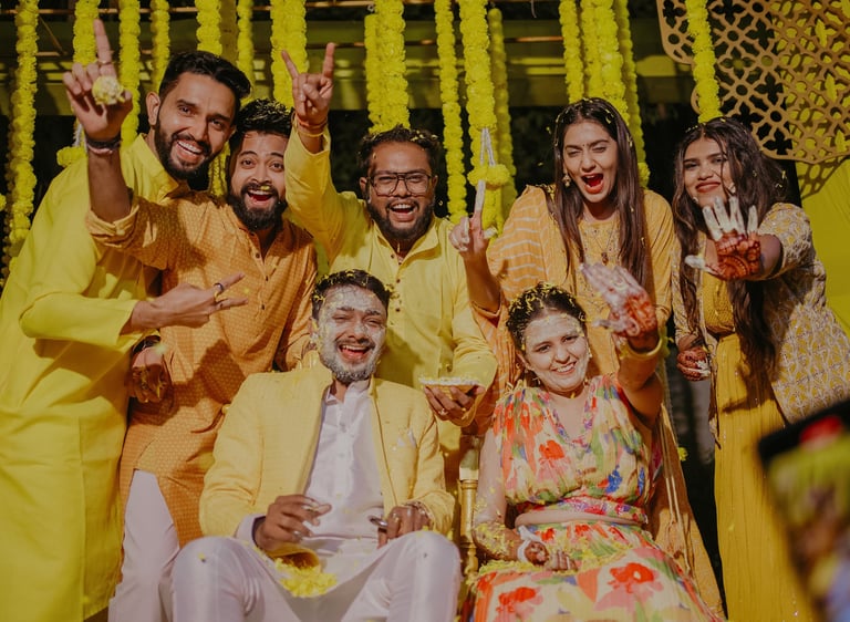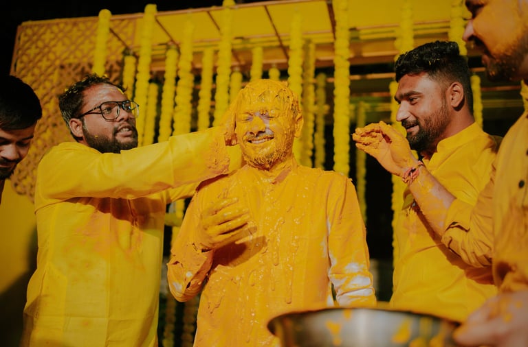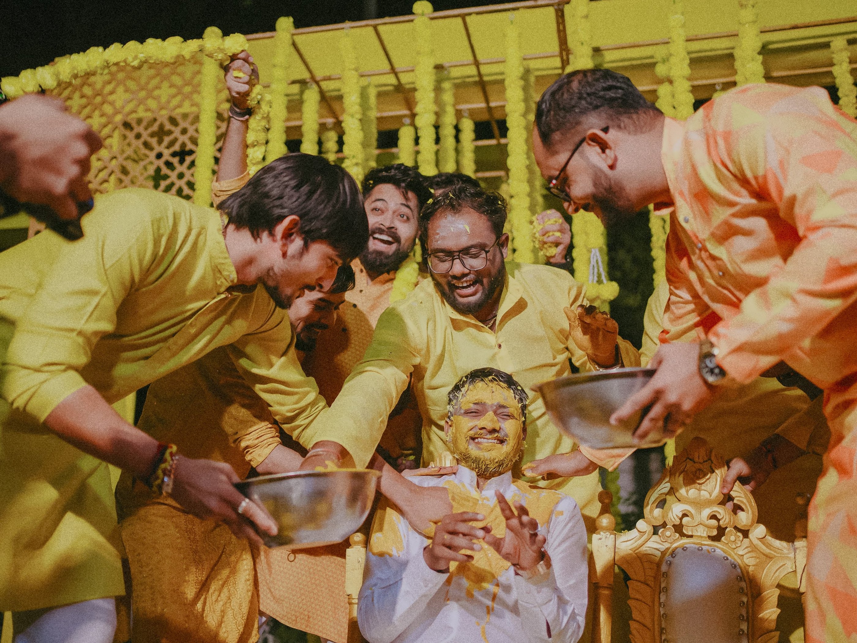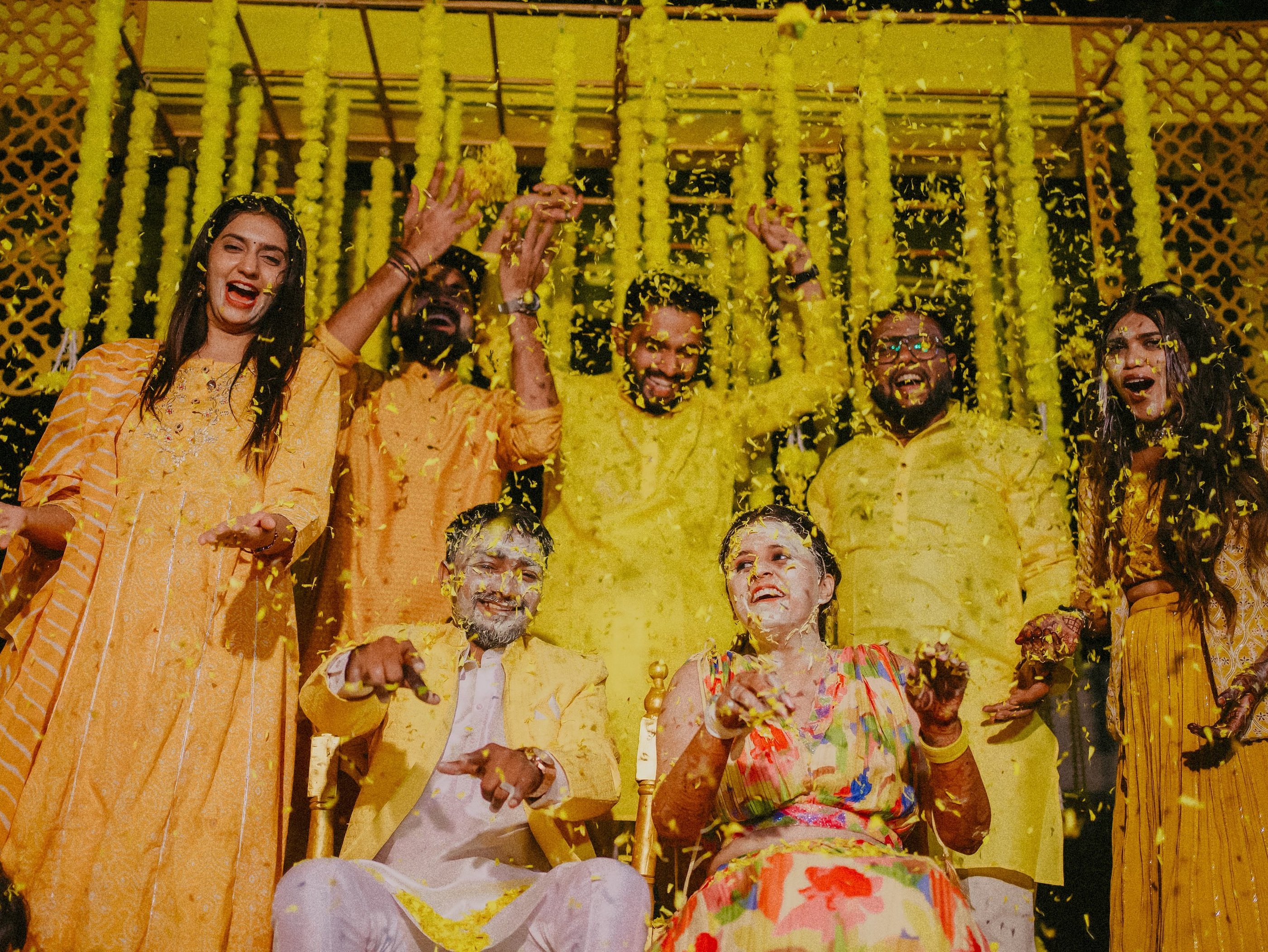 The festivities began with a high-spirited haldi ceremony. Set outdoors under warm Ahmedabad skies, the event was filled with vibrant colors, floral decor, and candid moments. Jatin, known by many as “Amdavadi Man” brought his trademark energy, while Sakshi glowed with excitement. Family and friends joined in with playful smears of turmeric, infectious laughter, and joyful dancing making the haldi ceremony especially rich with emotion and spontaneity.