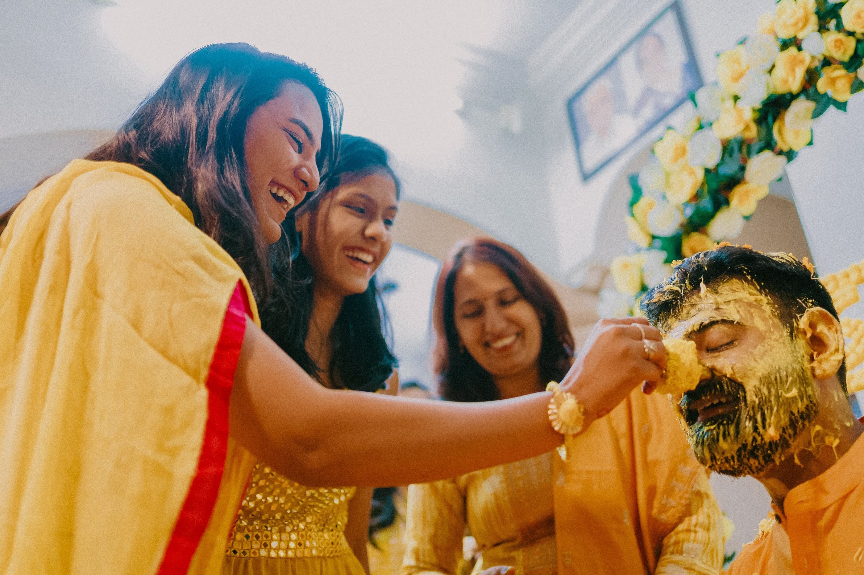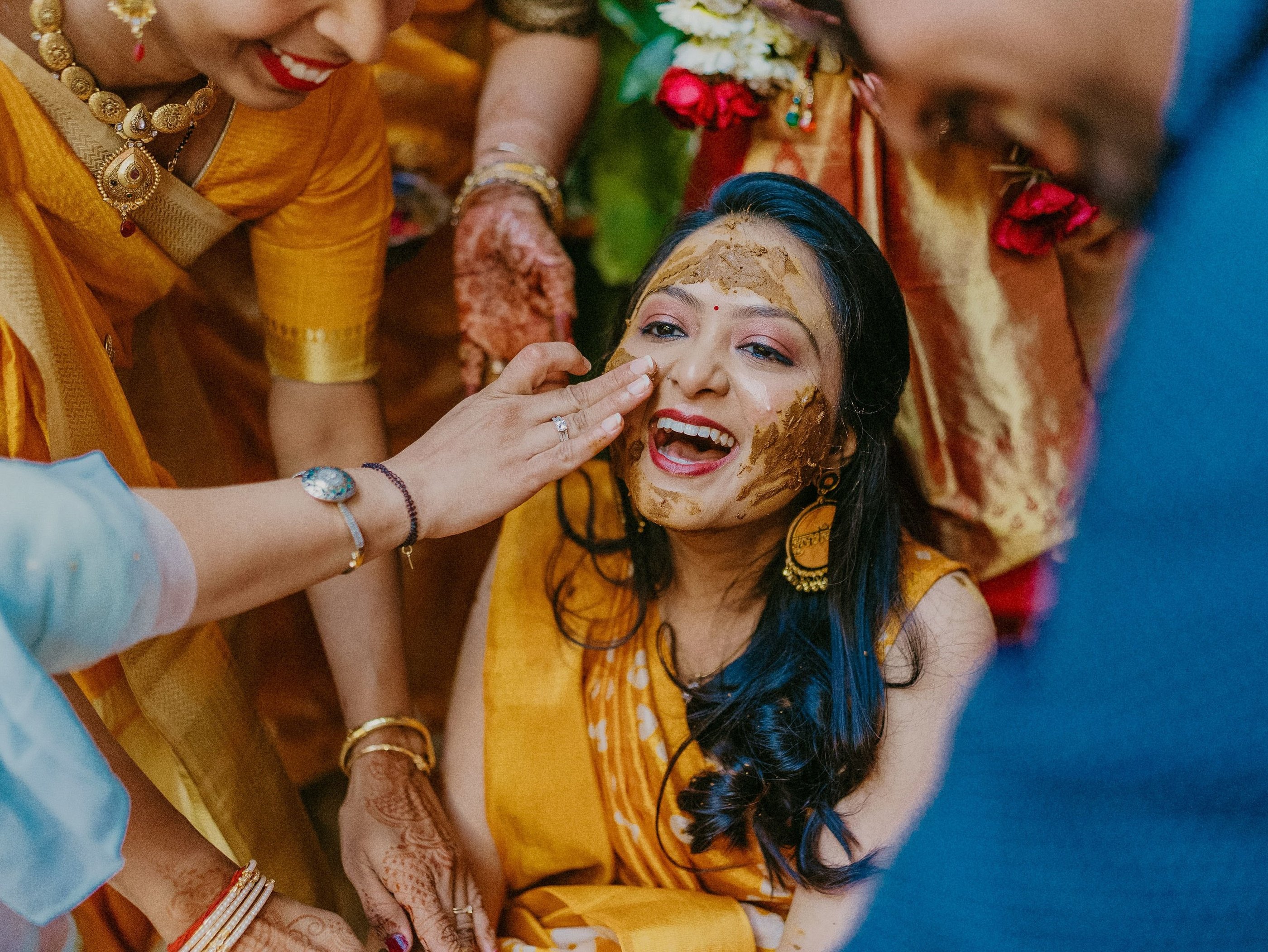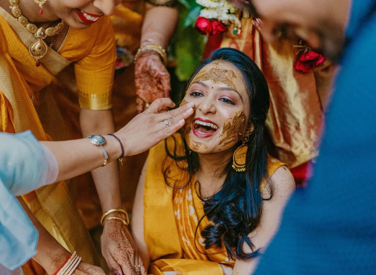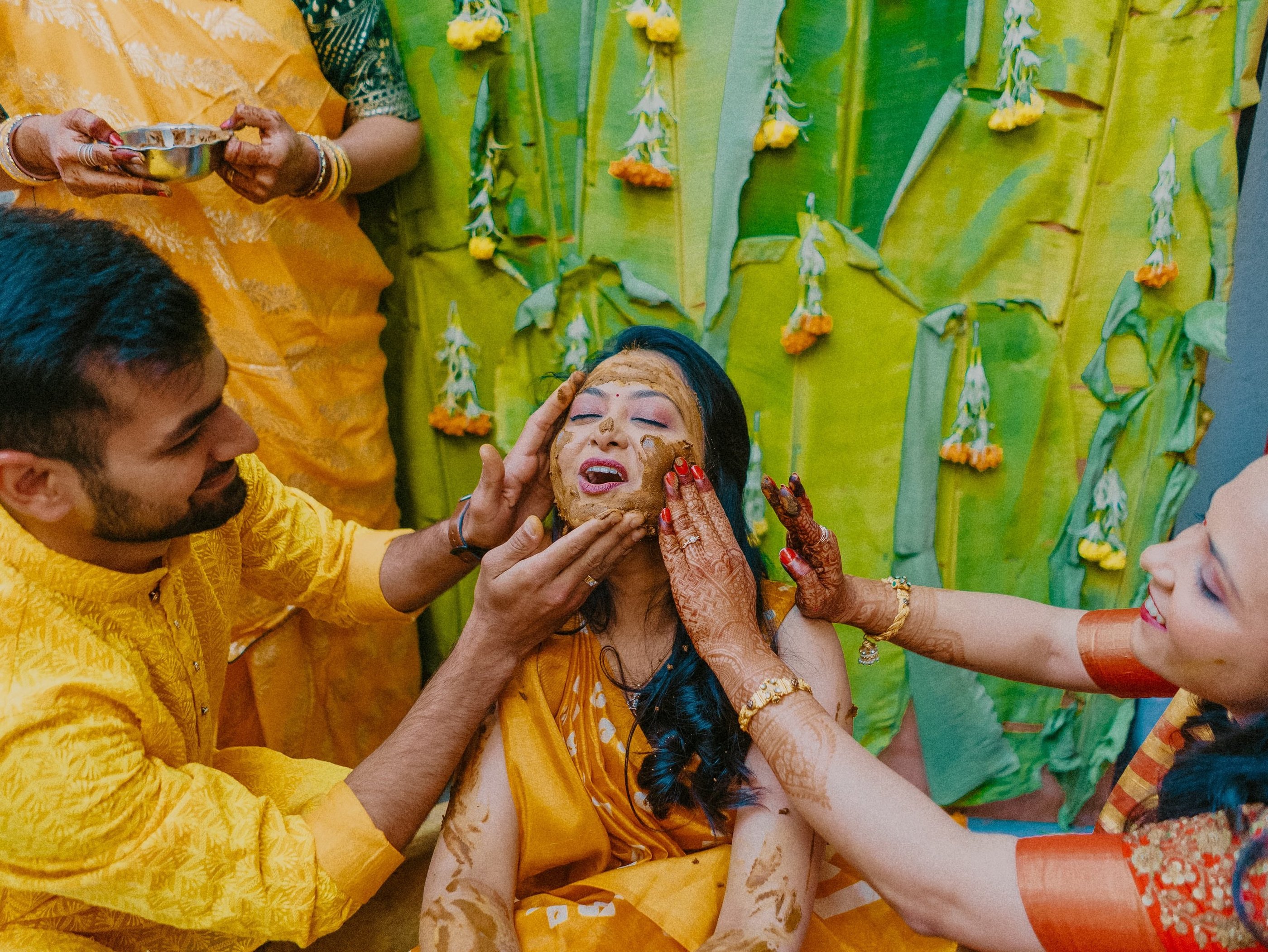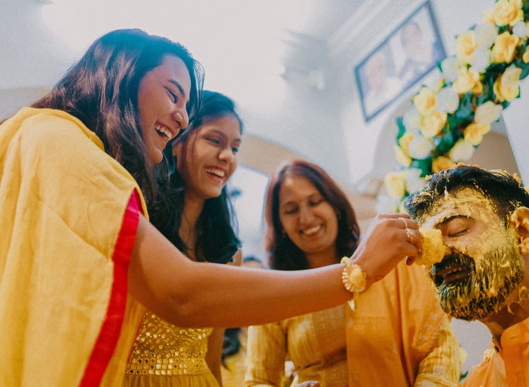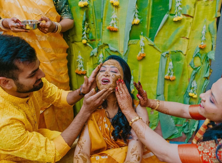 A joyful haldi ceremony surrounded by friends and family, the couple glowed with excitement as turmeric, laughter, and music filled the air.